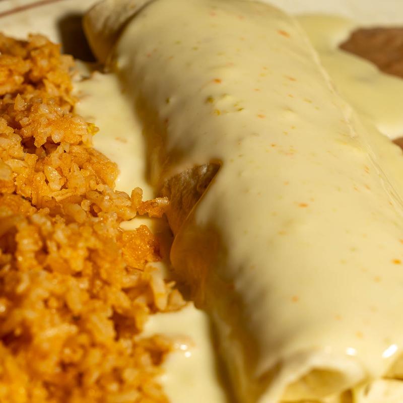 We stuff a flour tortilla with your choice of chopped beef, ground beef, or shredded chicken, then deep fry until golden brown. Drizzled with cheese dip. Served with lettuce, sour cream, guacamole, pico de gallo, Mexican rice, and refried beans.